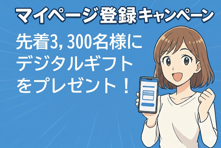 このたび、個人用マイページの運用開始を記念して、「マイページ登録キャンペーン」を実施いたします。以下のとおり、先着3,300名様にデジタルギフトをプレゼントします。(ハズレはありません!)